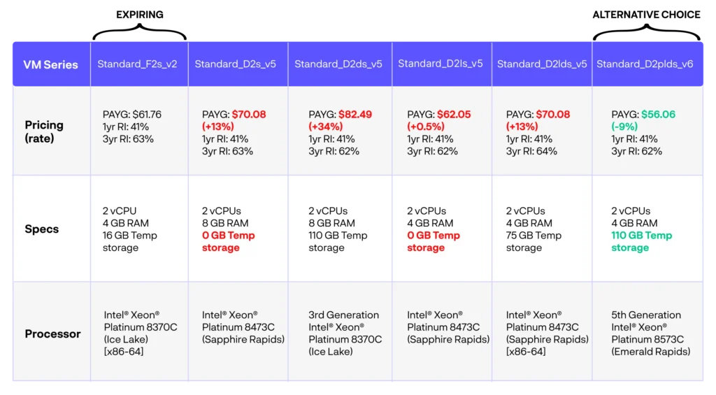 Microsoft recommends upgrading to the Dldsv5/Dlsv5/Dsv5/Ddsv5 series, but those VMs are either more expensive (Standard_D2ds_v5 is 34% higher PAYG) or fail specification requirements (Standard_D2s_v5 does not have temporary storage).